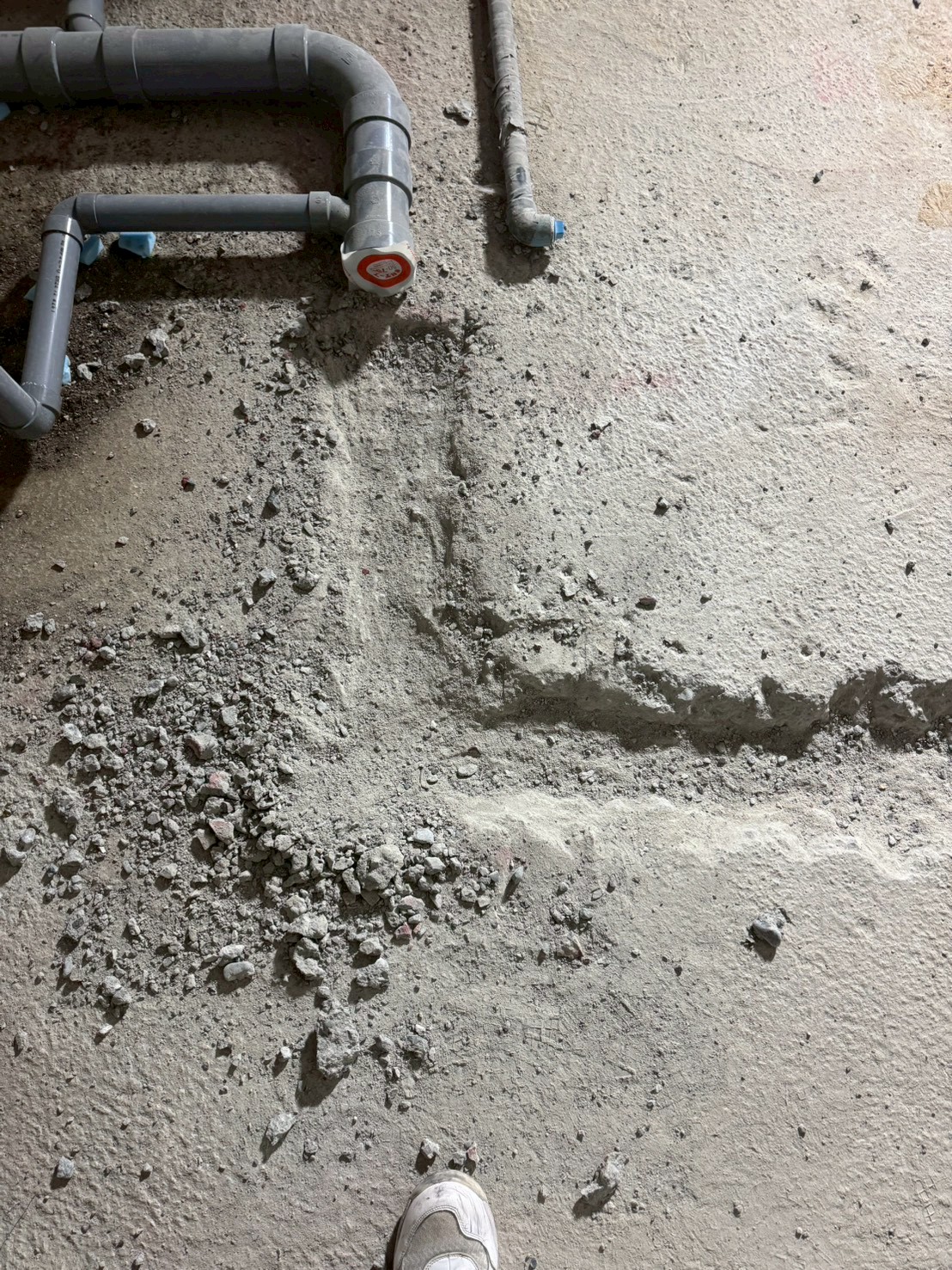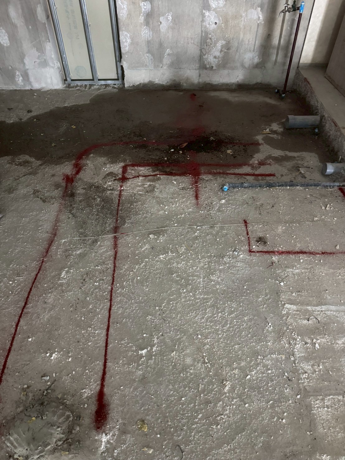 施工前に、配管や設備の位置を床に赤いマーキングで示す作業を行いました。正確な位置出しは、後工程をスムーズに進めるための重要な準備作業です。