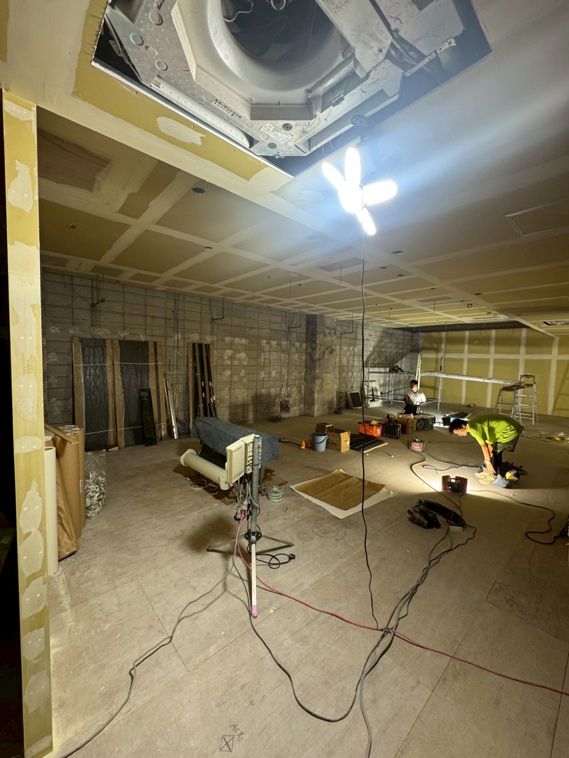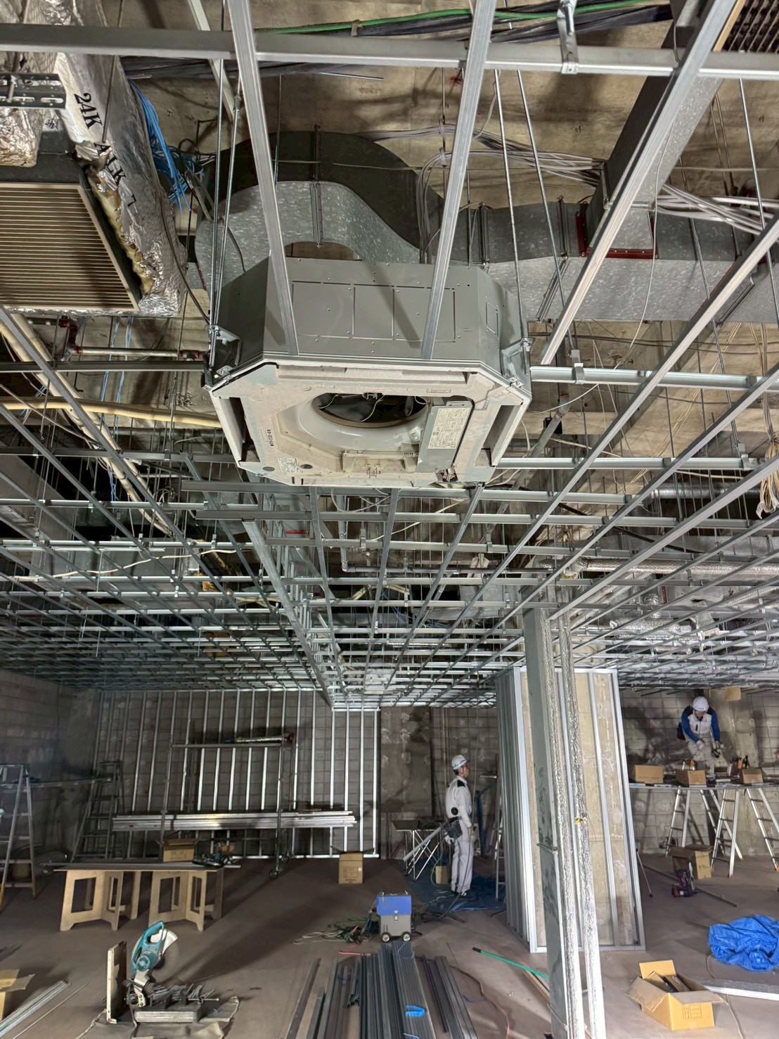 天井の軽量鉄骨工事、空調設備の配管工事を実施しました。バーチャルゴルフ施設に必要な空調設備を適切に配置し、快適な環境づくりの基盤を構築しました。
